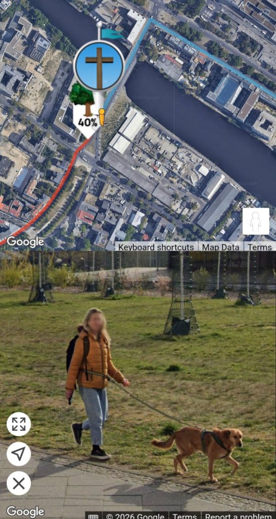 Photos from the Conqueror Virtual Challenges app 1. The Britz Canal forms a right angle from where we previously walked along it, soon to empty into the Spree River. (On TGP’s first mention of the canal, it was listed under its full name, the Britzer Verbindungskanal.) Pray for the person whose hand can be seen in today’s picture, that he will soon see the hand of God in his life pointing to Jesus, and respond in faith.